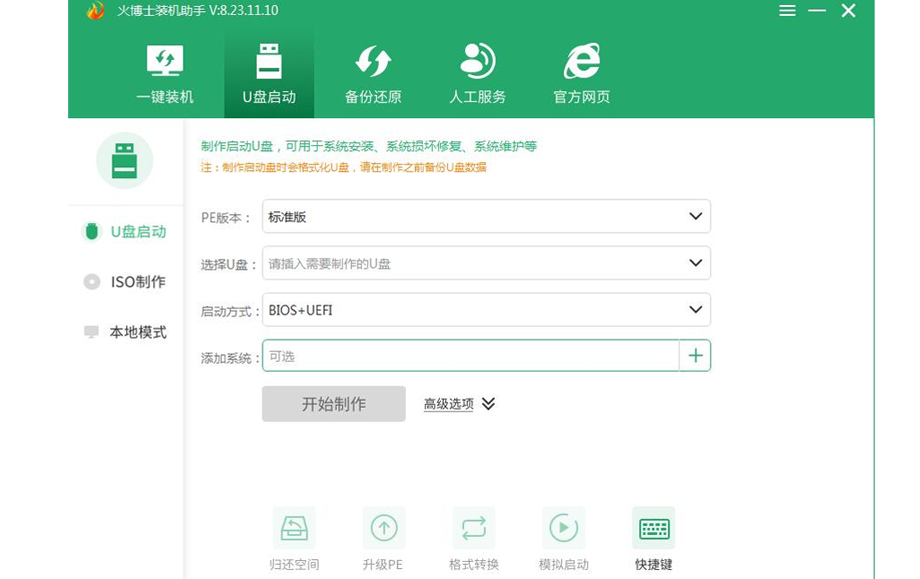 检测U盘是否正确插入(下图为插入)。同时请退出杀毒软件防止U盘被占用,最好选择性能较好,内存≥8G的U盘,确认插入后,点击“初始化”,然后点击“一键制作启动U盘”。