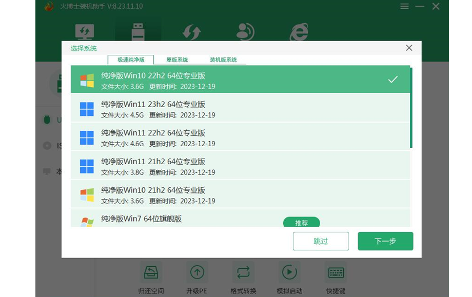 选择要下载的系统,U盘制作完成后会自动下载并复制到U盘中,方便装机,如果选择跳过,需要自己准备系统镜像并复制到U盘中。